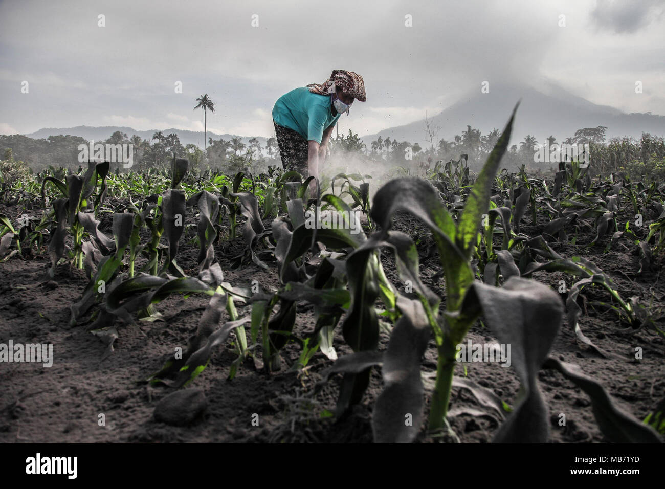 Karo North Sumatra Indonesia 7th Apr 2018 A Farmer Cleans His Dust Covered Farmland In Tiga Nderket Village After The Recent Eruption Of Mount Sinabung Spewing A Massive Volcanic Ash Column Up To